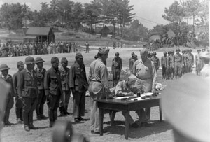 Japanese surrender, signing of documents ceremony, American Representative signing the document. Ted J. Osenko Photograph Collection.