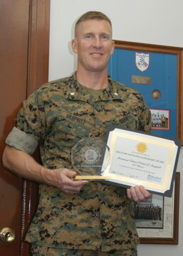 Lieutenant Col. Patrick J. Campbell, staff judge advocate for the Depot, was presented with a certificate and an engraved, glass trophy for the Civitas Military Officer Leadership award by the Beaufort Regional Chamber of Commerce April 20.